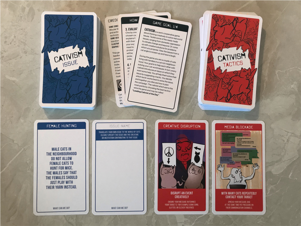 In turn, one player is the Leading Cativist and introduces an issue. As a group of cativists you all help to solve this issue by suggesting creative activism tactics. Then you discuss these tactics and plan a mindblowing campaign together. The cativist who earns the most points by proposing the best tactics wins the game and earns the title “Leading Cativist of the Day”.